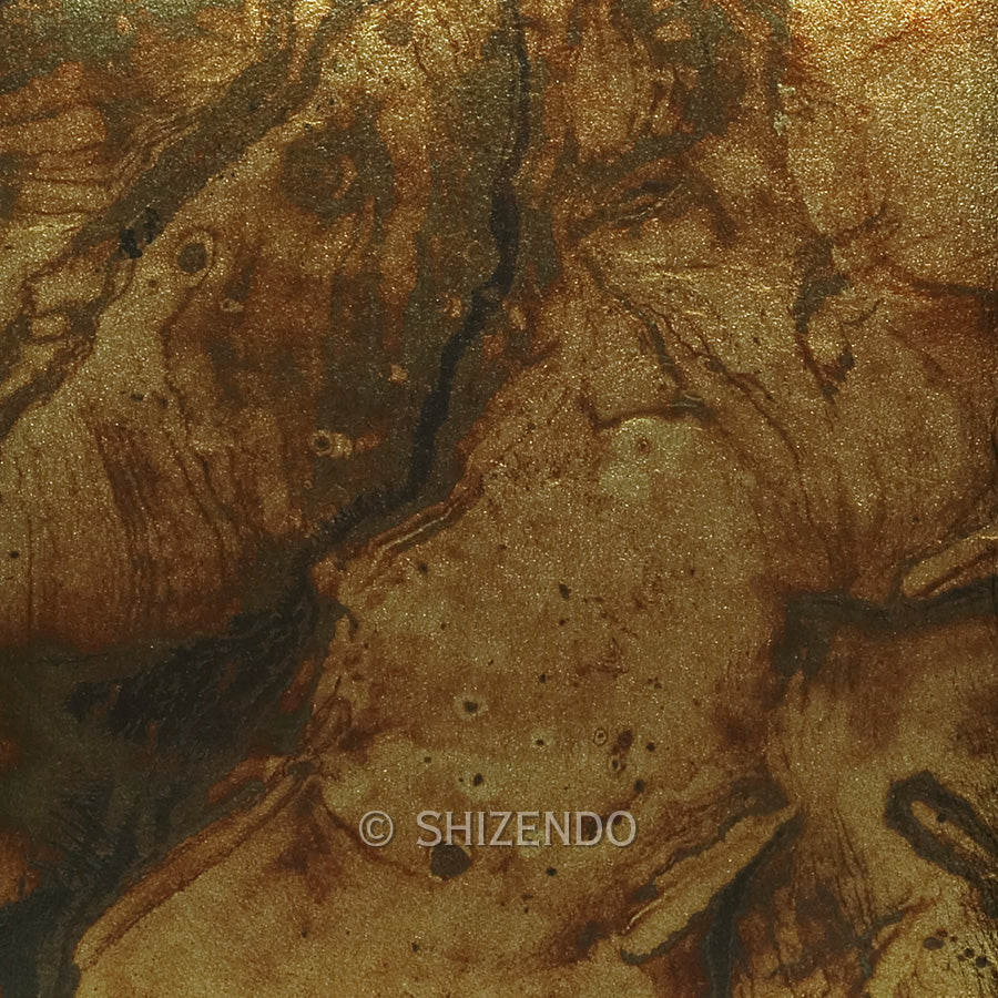 「虹彩箔」は銀箔に樹脂と染料で着色した箔に、焼き付け加工により墨流しのようなマーブル模様を入れています。