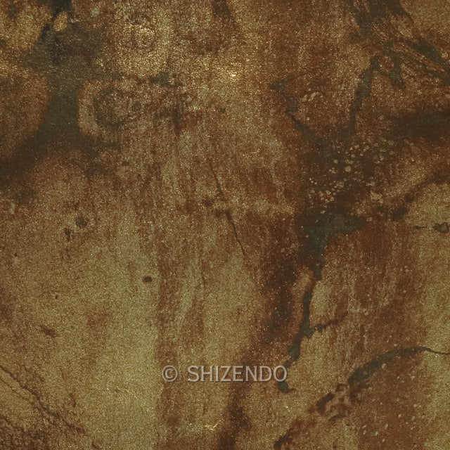 「虹彩箔」は銀箔に樹脂と染料で着色した箔に、焼き付け加工により墨流しのようなマーブル模様を入れています。