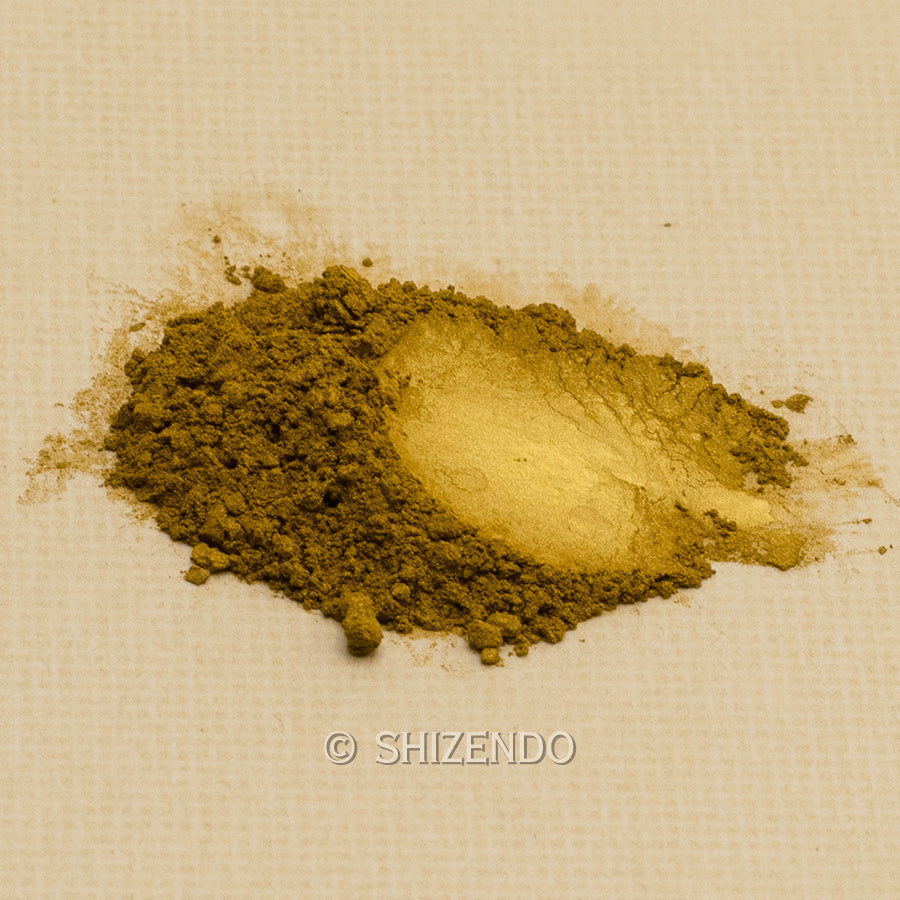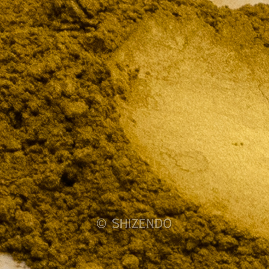 金箔を細かく練り潰し、溶かしたニカワ等と共に練ることで小さくちぎれて微粉末状になった物を「金泥」と呼びます。金箔の厚さは約0.2μで、これを横方向に平均3μ程度まで粉砕しています。その後、大量の水で膠分のみを洗い流し、乾燥させた粉は小麦粉の様に細かく滑らかで、描画材料として優れています。