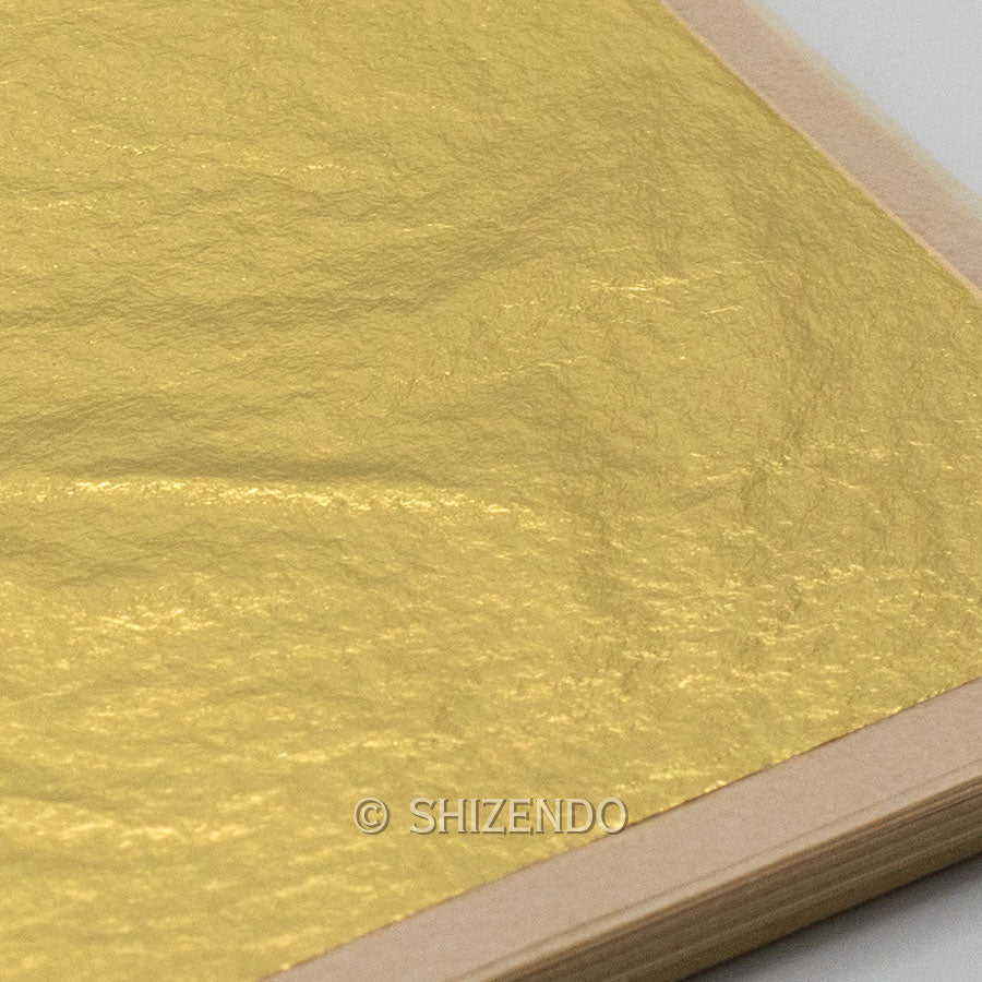 縁付き箔は和紙で伸ばされ、一枚一枚皮板の上で正方形に裁断された箔です。400年前から続き伝統技法で作られています。打ち紙に使用した和紙の目の風合いが表面に出るのが特徴で、断切りに比べるとしっとりした厳かな輝きの箔です。