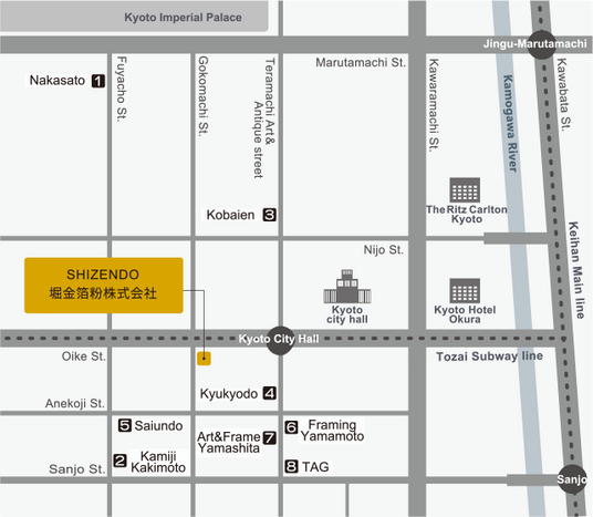 店舗は地下鉄・阪急・京阪の三路線から徒歩圏内にあり、大阪からのアクセスも大変便利です。店舗の周辺は歴史的建造物や看板などの見所も多く、骨とう品店・ギャラリー・アート材料を扱う老舗が点在しており、アート好きの方にとって魅力的なエリアです。